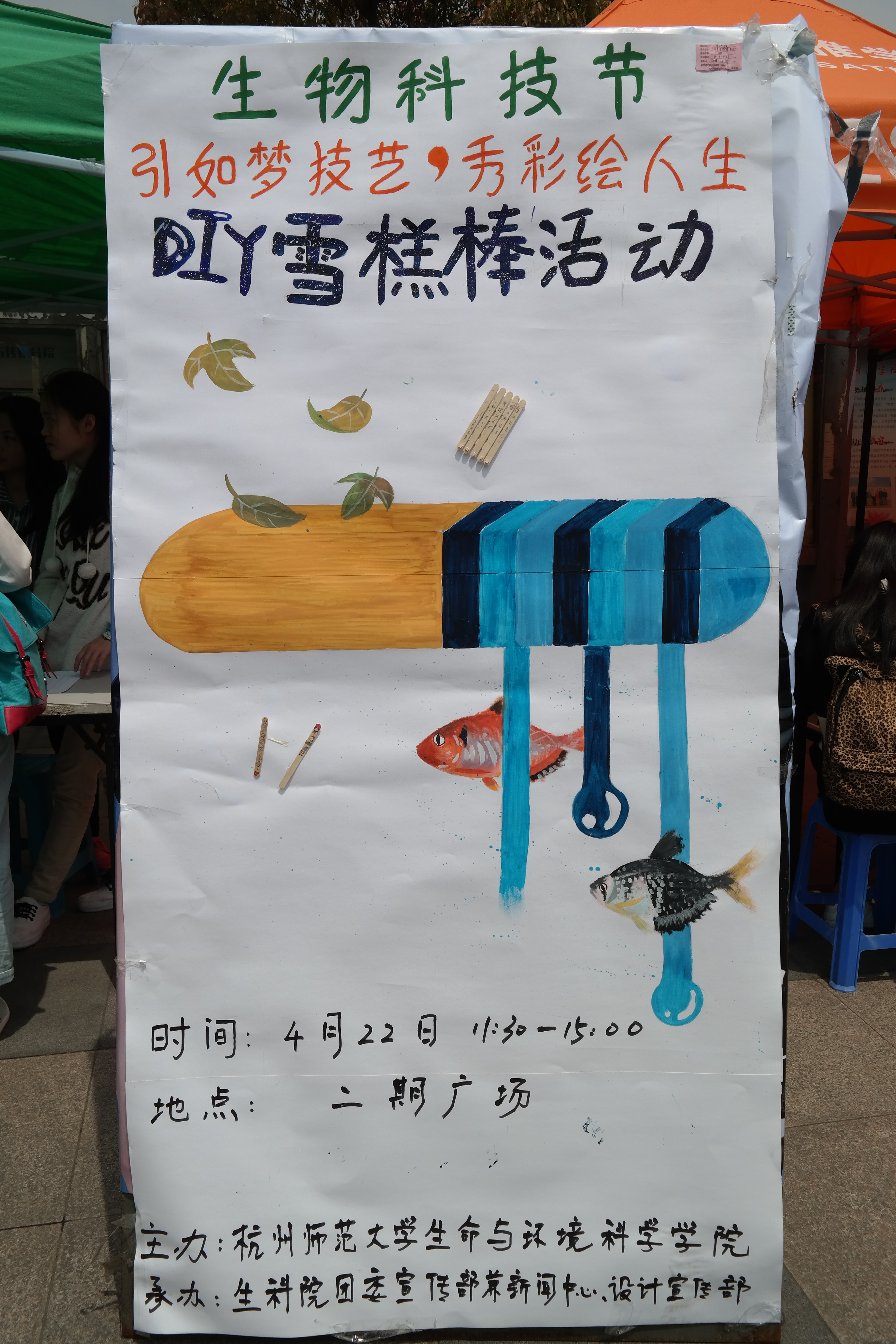 4月22日中午11点30分,在杭州师范大学下沙校区二期食堂广场举办了由生命与环境科学学院团学联团委宣传部兼新闻中心和设计宣传部联合组织的生物科技节之“引如梦技艺,秀彩绘人生”雪糕棒DIY制作活动。活动当日,场地帐篷前人潮涌动,人气爆棚。