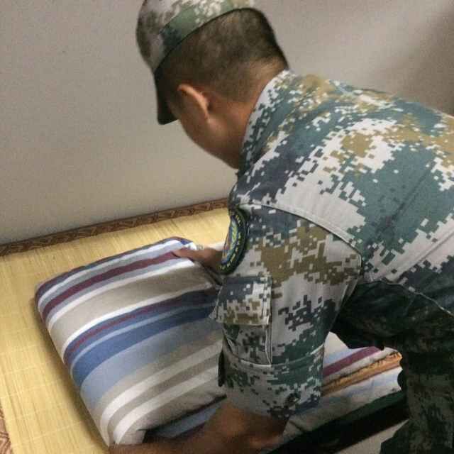 教官在提出一些规范要求后,亲自示范每一名军人所必须掌握的内务整理。传说中的“豆腐块”在教官熟练到位的动作下很快完成,看得同学们眼花缭乱。在同学们的强烈要求下,教官重新缓慢地分解叠“豆腐块”被子的步骤,在同学们看来微不足道的叠被子中,其实也隐藏着它独特的“方方正正”的方式和学问。接着教官对其他日用品的标准摆放也进行了深刻的讲解和示范。最后,新生们根据教官的指导重新开始整理内务,同时教官也指出他们错误的地方并进行纠正。