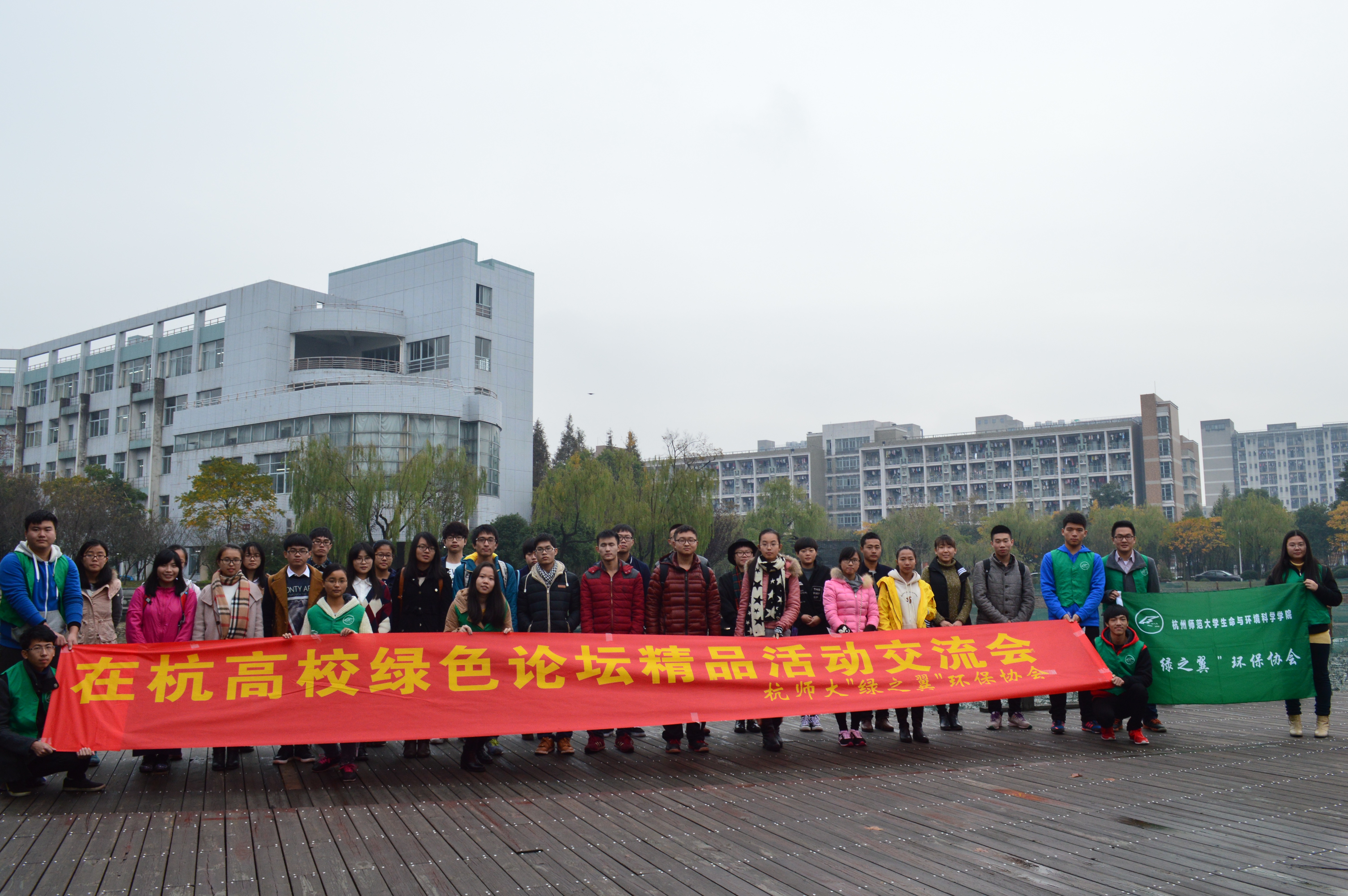 活动的最后,各大社团的代表们以及"绿之翼"环保协会的到场人员一起在蕙风湖畔进行了集体合影留念,为这一次的在杭高校绿色论坛精品活动交流会画上了圆满的句号。此次活动促进了各高校之间的工作交流,使参与活动的嘉宾们收获了不少创意和经验,希望今后的活动能够越办越精彩!