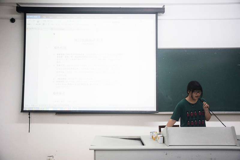 接着,由团委宣传部部长兼新闻中心主任王柯诺向大家介绍关于实践活动过程中的稿件要求。每个参与实践活动的队伍都需要写关于此次活动的稿件,稿件主要分为四个部分。第一部分是“最新报道”,即 800字以内的新闻稿,由小分队宣传联络员负责,采取一事一报的形式报导今天的活动,视日程安排而定,每支队伍每天1—2篇,每篇稿件需要2张及以上照片。第二部分是“实践日记”,即1000字以内的日记稿件,侧重每一个参与者在活动中的真情实感,内容是组员参加活动的内心感受,要求有文采,感情真挚,对活动、对社会实践有新的领悟,每支队伍每天2—5篇。第三部分是校外媒体对此次活动的相关报道。最后一个部分是“实践掠影”,即实践过程中的图片新闻,照片3-10张,每张照片文件必须命名。除此之外,王柯诺同学还为大家介绍了稿件格式以及投稿地址,在座的各代表们都听得格外认真,内心对此次实践的热情与渴望溢于言表。