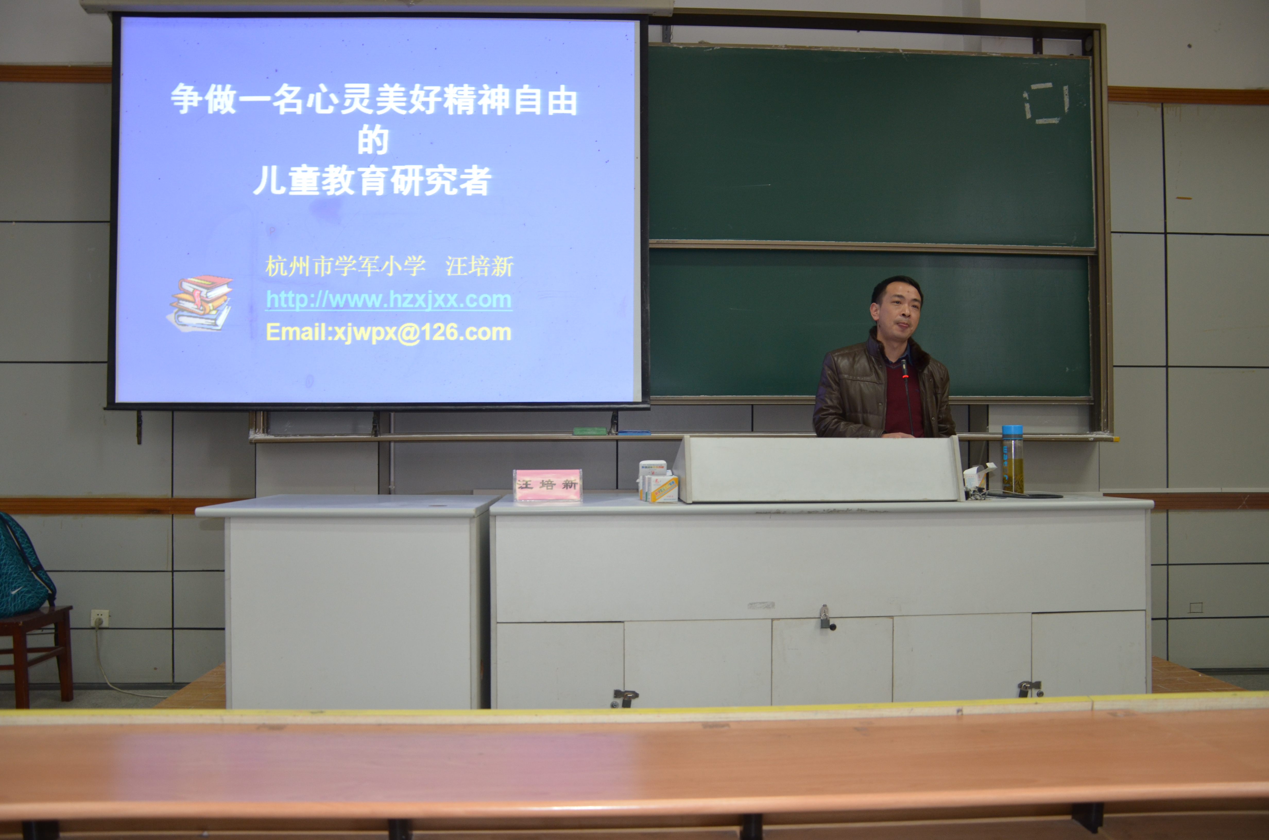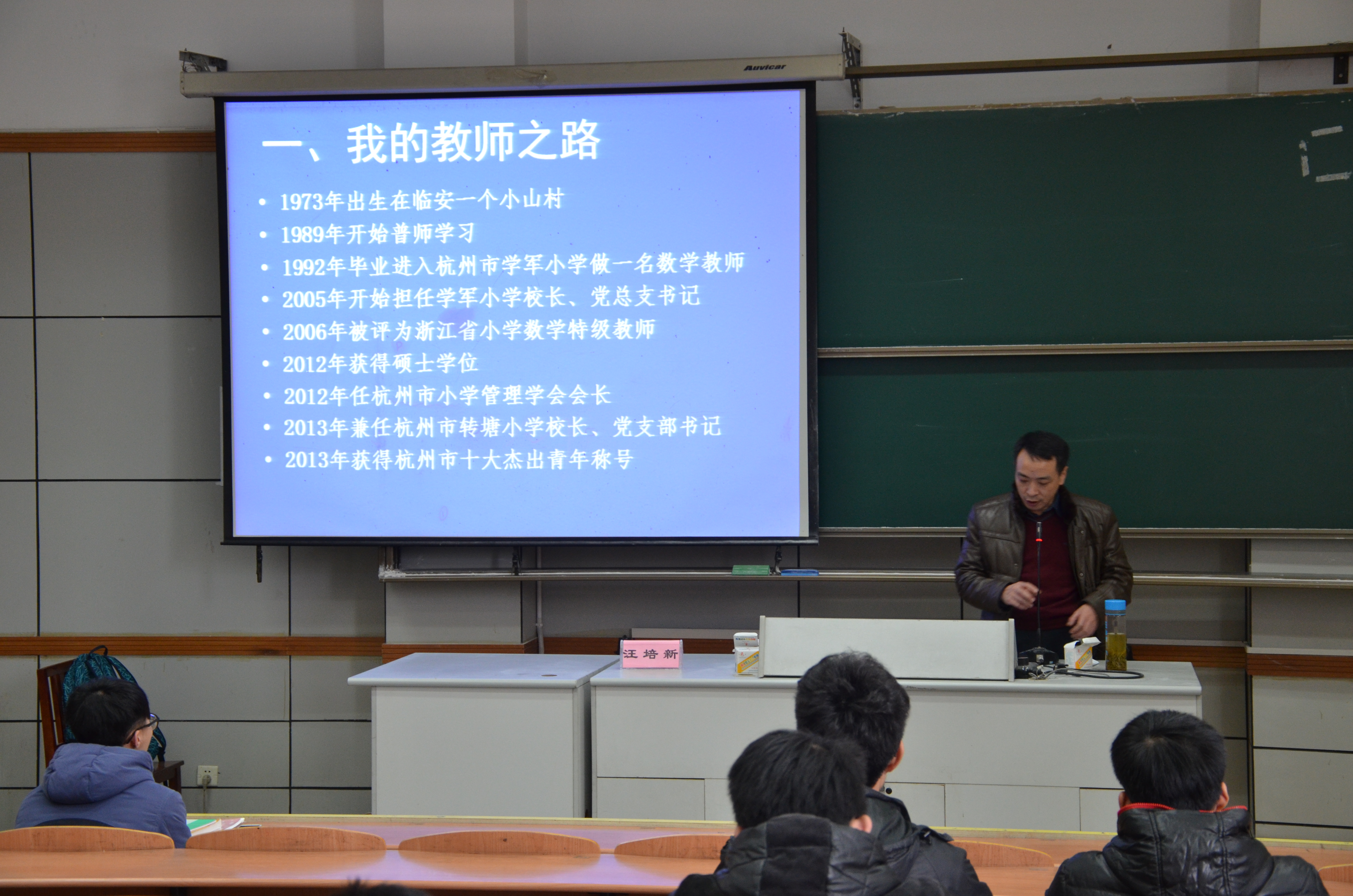 2016年12月14日下午两点,由浙江省杭州市学军小学校长,省特级教师汪培新主讲的相关就业讲座,在我校教学B楼102顺利开展。