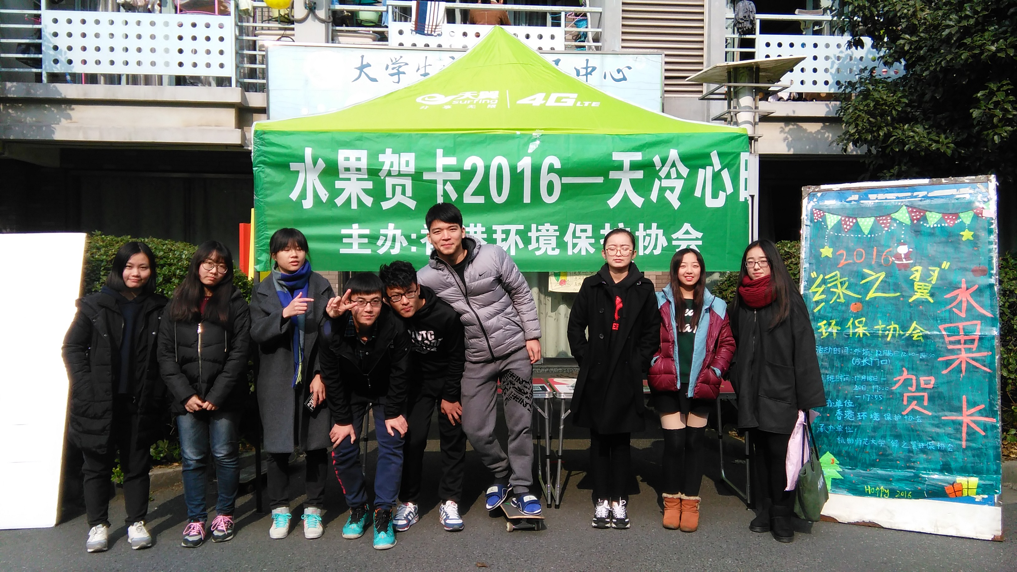 12月16日,杭州师范大学生命与环境科学学院"绿之翼"环保协会在大学生成长指导中心门口成功举办了2016全国高校水果贺卡的外场宣传活动。水果贺卡是由香港环境保护协会主办的一个延续了十年的公益环保项目,提倡同学们用水果代替纸质贺卡,在圣诞节传递祝福,旨在唤起同学们的环保意识。