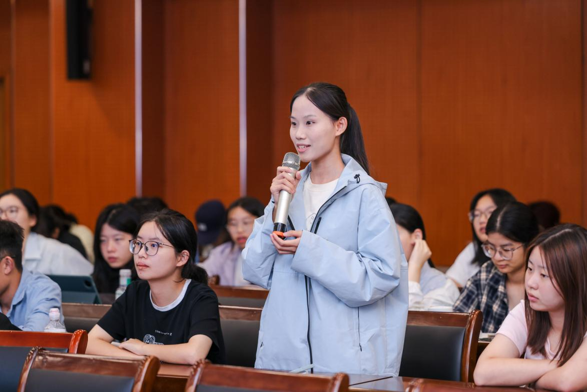 在互动环节,现场学生踊跃发言、积极提问,问题涵盖专业学习、创业选择及时间平衡等多个方面。针对这些提问,郎秋蕾一一回应并结合实际展开细致解答:她认为,若过度纠结未来,反而容易引发焦虑,建议先确定好大方向,再踏实做好每一步;并表示“自洽”是最好的状态,要学会与自己和解。同时,她提议同学们听从内心想法,静下心思考当下正在做的事,明确自身目标,以良好的精神状态积极面对未来的不确定性与挑战。此外,她还提醒同学们不要“内耗”——不纠结过去、不焦虑未来,专注当下,朝着目标持续坚持。