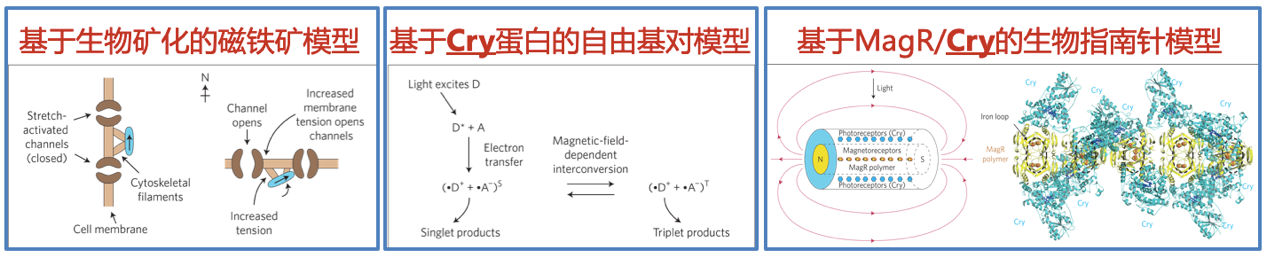 在我们课题组和国际上诸多课题组的努力下,基于MagR/Cry蛋白复合物的生物指南针模型已经逐渐成为了动物磁导航的三个主流模型之一(图2):