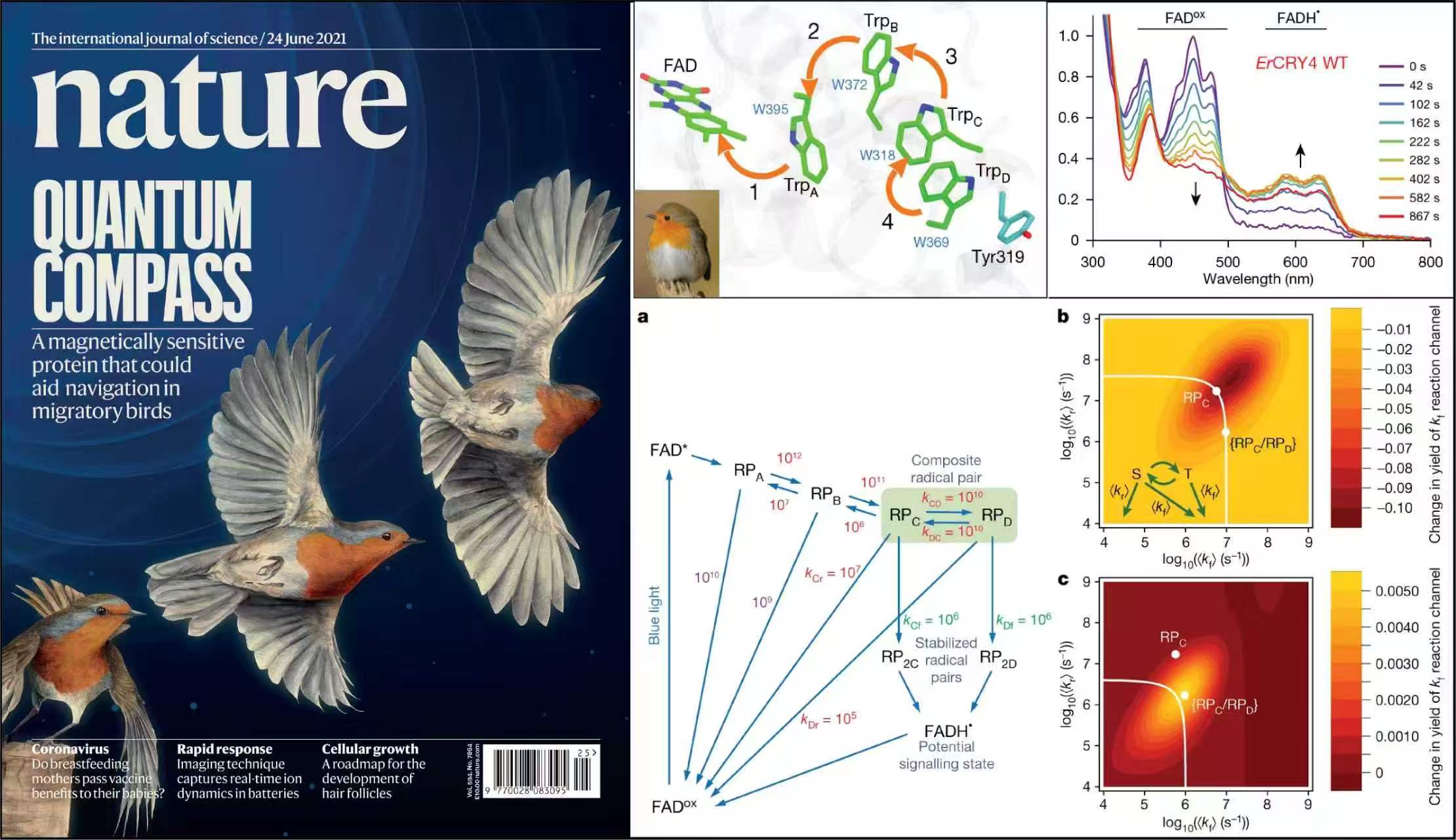 15.    Jingjing Xu, Lauren E. Jarocha, Tilo Zollitsch, Marcin Konowalczyk, Kevin B. Henbest, Sabine Richert, Matthew J. Golesworthy, Jessica Schmidt, Victoire Déjean, Daniel J. C. Sowood, Marco Bassetto, Jiate Luo, Jessica R. Walton, Jessica Fleming, Yujing Wei, Tommy L. Pitcher, Gabriel Moise, Maike Herrmann, Hang Yin, Haijia Wu, Rabea Bartölke, Stefanie J. Käsehagen, Simon Horst, Glen Dautaj, Patrick D. F. Murton, Angela S. Gehrckens, Yogarany Chelliah, Joseph S. Takahashi, Karl-Wilhelm Koch, Stefan Weber, Ilia A. Solov’yov*, Can Xie*, Stuart R. Mackenzie*, Christiane R. Timmel*, Henrik Mouritsen* & Peter J. Hore*, Magnetic sensitivity of cryptochrome 4 from a migratory songbird, Nature, 594(7864): 535-540 (2021) (封面长文,共同通讯作者)